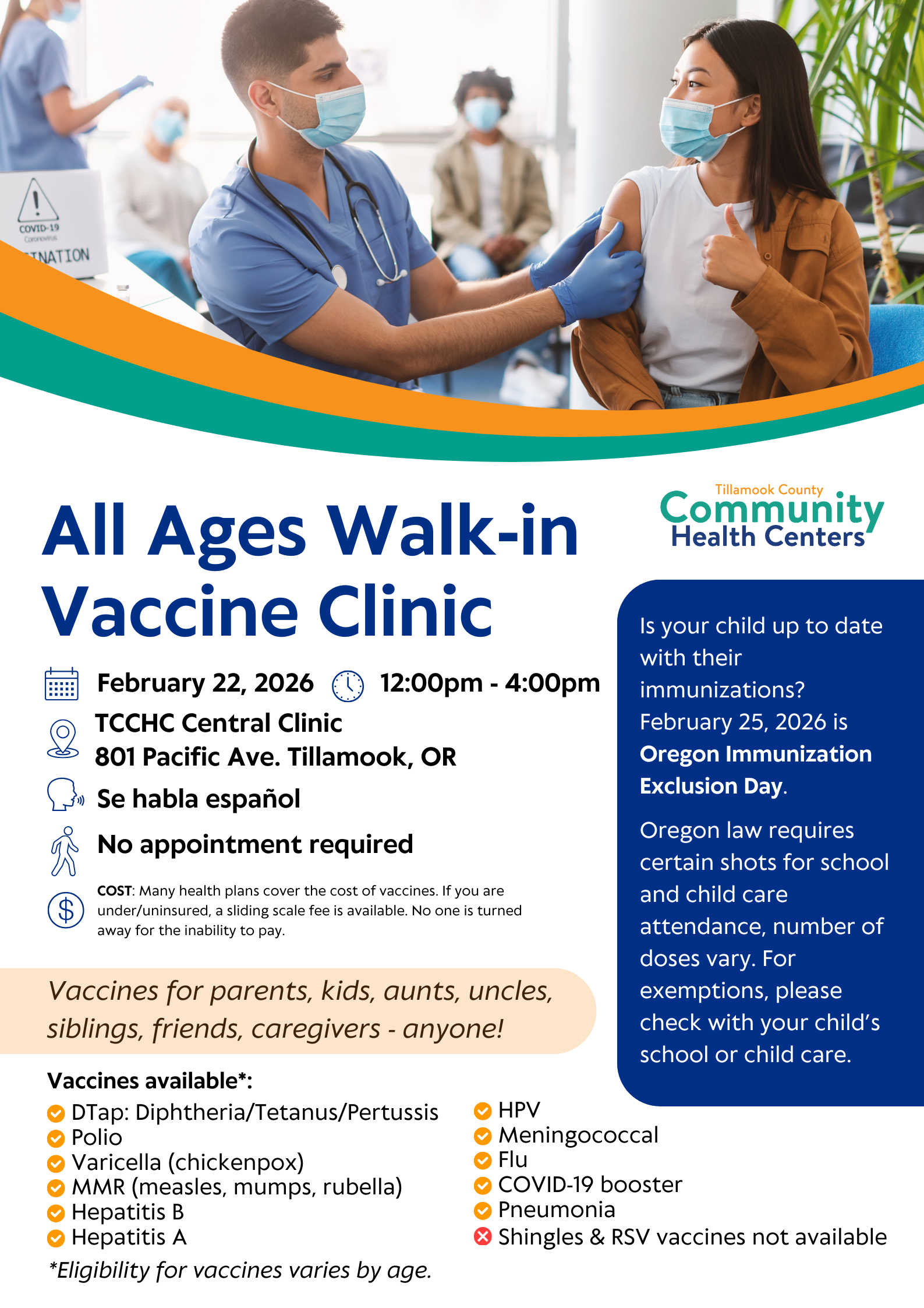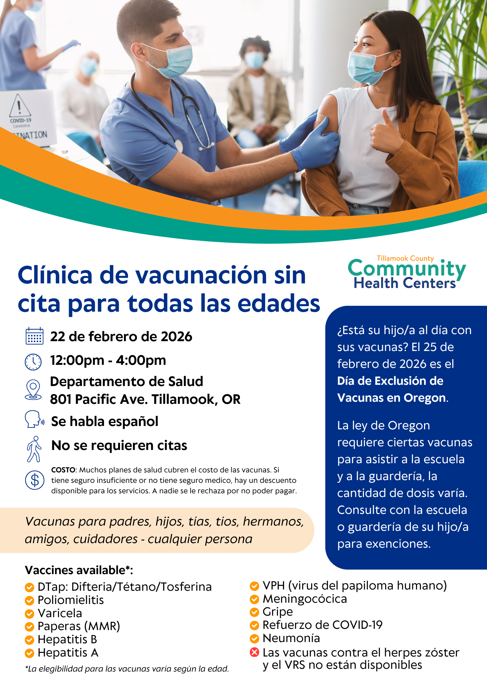 TILLAMOOK, Ore. — Habrá una clínica de vacunación sin cita el domingo 22 de febrero de 2026 para todas las edades. Consulta el folleto de abajo para más detalles.